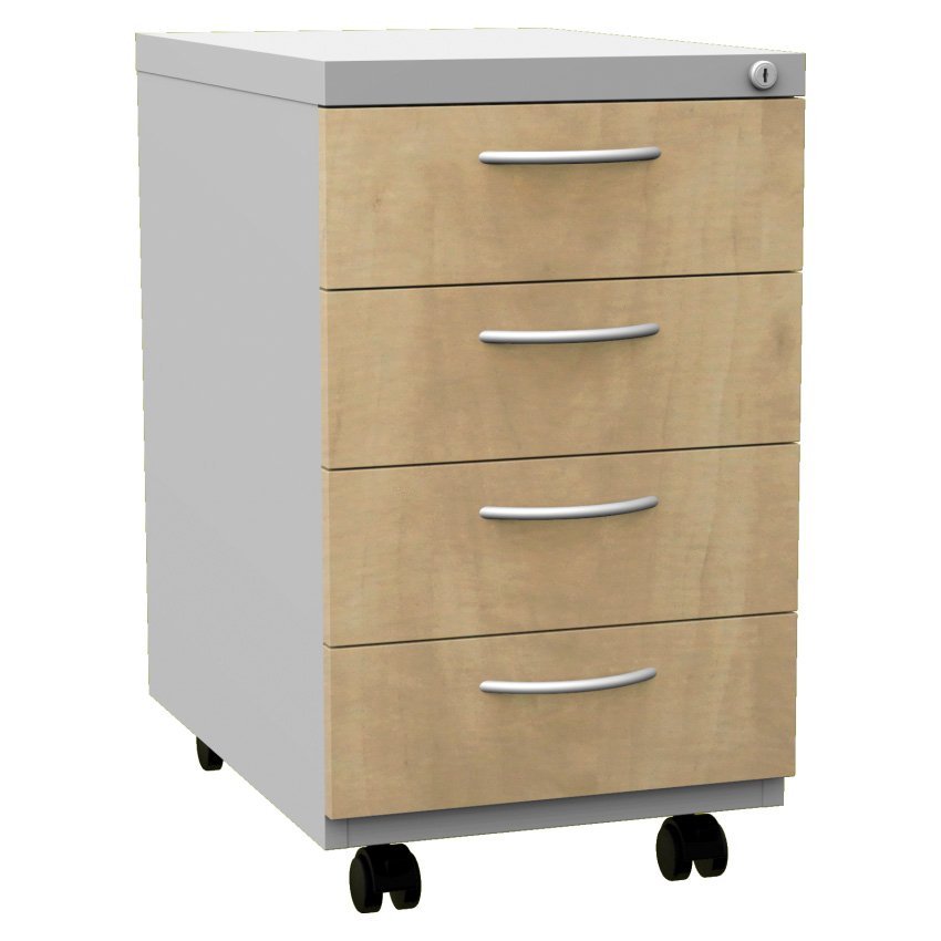 Kancelárske kontajnery mobilné, centrálny zámok, jedna štandardná zásuvka, jedna na závesné kapsy. Výška 495 alebo 501, šírka 420, hĺbka 565 mm. Koliesko na spodnej hrane hĺbokej zásuvky zaisťuje stabilitu i pri úplnom otvorení. Varianta bez hornej dosky alebo s hornou dekoratívnou doskou hrúbky 6 mm. Výsuv štandardnej zásuvky 80 alebo 100%, výsuv vysokej zásuvky 100%.