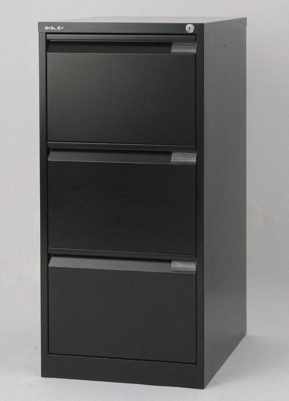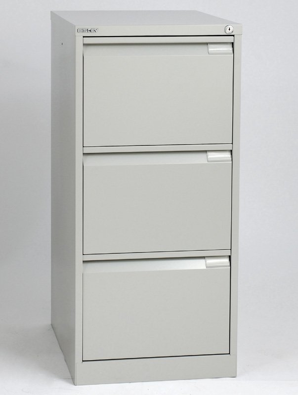 Trojzásuvkové kovové kartotéky pre dokumenty alebo závesné zakladače formátu A4 alebo Foolscap, šírka 413 alebo 470, výška 1016, hĺbka 622 mm, centrálny zámok, rôzne farby. Súčasťou každej zásuvky je vložené perforované dno + 2x deliaca priečka. Skladom v šírke 413 mm vo farbe svetlosivej.