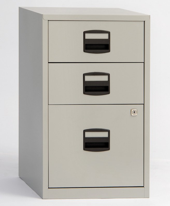 Trojzásuvkové kovové kartotéky Bisley PFA3 pre dokumenty a závesné kapsy formátu A4. Šírka 413, výška 672, hĺbka 400 mm, rôzne farby. POZOR - vhodné len na obmedzené používanie - napr. pre domácu kanceláriu. Pri plnej kancelárskej prevádzke má kartotéka skrátenú životnosť.