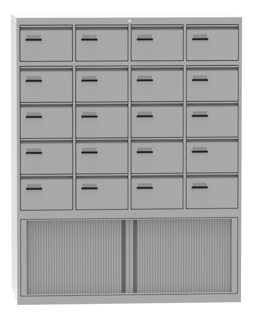 Dvadsaťzásuvková kovová kartotéka pre dokumenty formátu A5. Šírka 1122, výška 1350, hĺbka 590 mm. Vnútorný rozmer každého oddelenia výška 161 x šírka 217 x hĺbka 520 mm. Farba sivá RAL 7035.