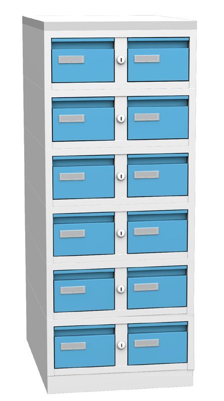 Dvanásťzásuvková kovová kartotéka pre dokumenty formátu A6. Výška 1250, šírka 438, hĺbka 600 mm. Farba korpusu svetlosivá RAL 7035.