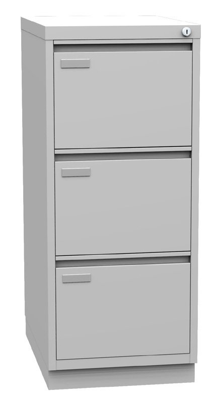 Trojzásuvková kovová kartotéka pre dokumenty a závesné kapsy formátu A4. Výška 962, šírka 404, hĺbka 600 mm. Farba korpusu RAL 7035 svetlosivá.