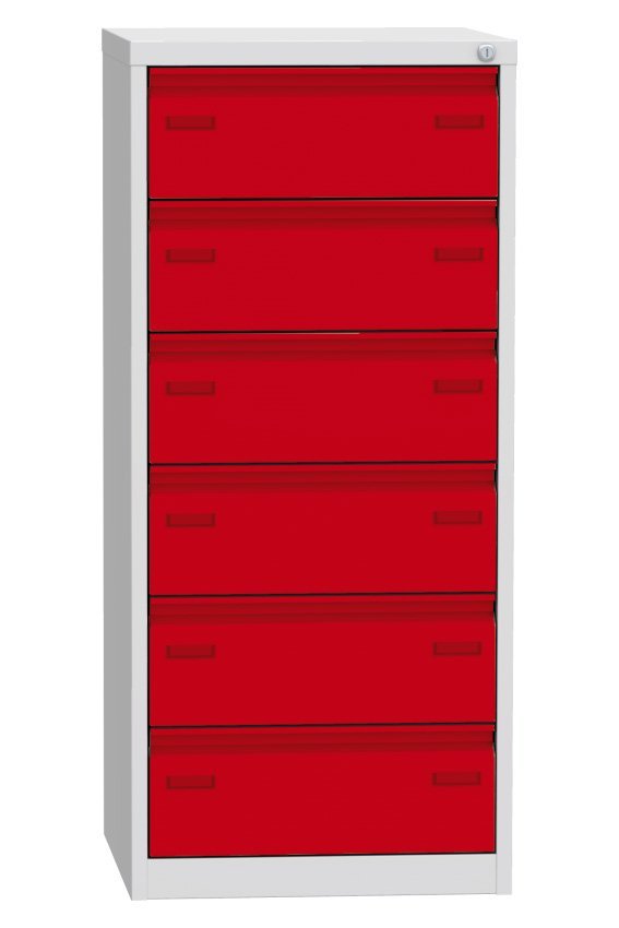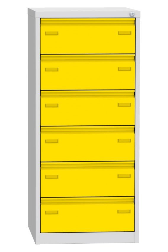Lístkovnica pre formáty A5 šesťzásuvková (v každej zásuvke sú 2 oddelenia). Výška 1250 x šírka 560 x hĺbka 600 mm. Kovový korpus vo farbe svetlosivej RAL 7035, zásuvky v rôznych farbách, centrálny zámok.