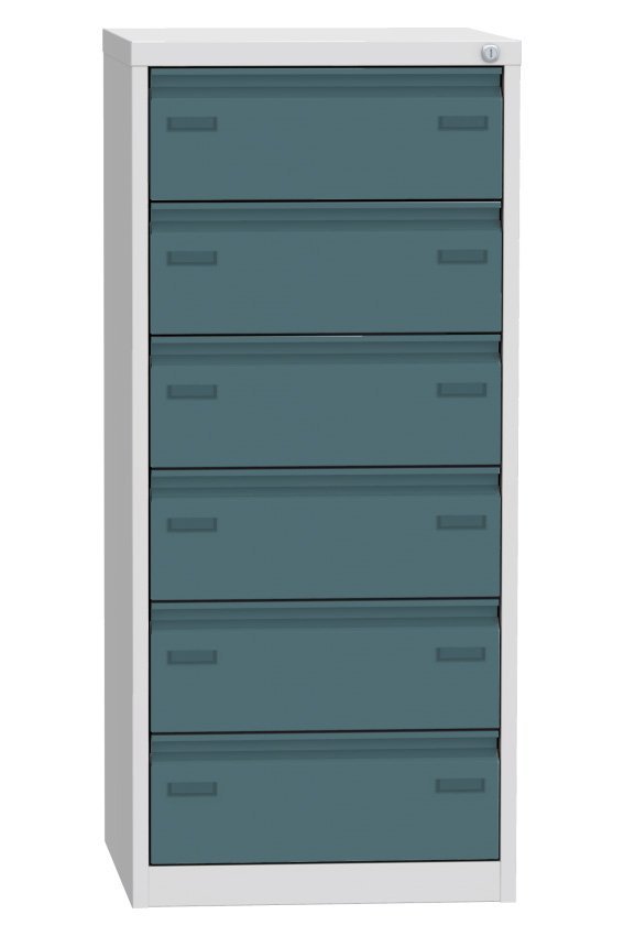 Desaťzásuvková kovová kartotéka pre dokumenty formátu A5. Výška 1250, šírka 560, hĺbka 600 mm. Farba korpusu svetlosivá RAL 7035, rôzne farby zásuviek.