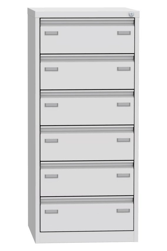 Lístkovnica pre formáty A5 šesťzásuvková (v každej zásuvke sú 2 oddelenia). Výška 1250 x šírka 560 x hĺbka 600 mm. Kovový korpus vo farbe svetlosivej RAL 7035, zásuvky lamino v dezénu buk, breza alebo čerešňa. Centrálny zámok.