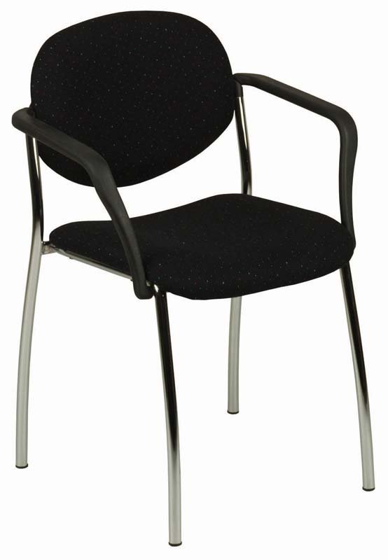 Konferenčná stolička stohovateľná, kostra oceľová štvornohá vo farbe N1 čierna, N2 efekt hliník alebo N4 chrom, s područkami, čierne krycie plasty sedadla a operadla a čierne záslepky chrbtového uchytenia operadla.