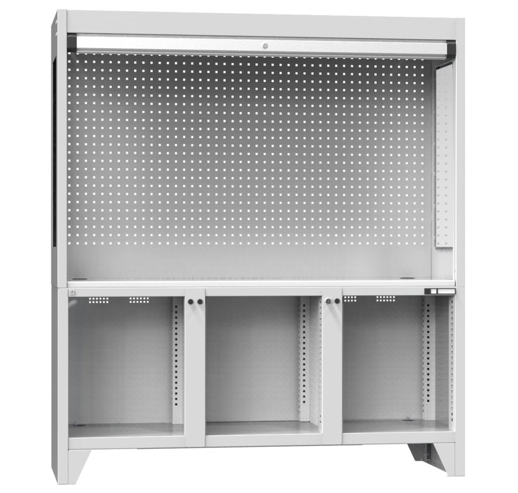 Laminovaná pracovná doska hrúbky 28 mm, samonavíjacia roleta s hliníkových lamiel RAL 7035, tvrdená bočná skla, perforovaná zadná stena. Výška 2030, šírka 1800, hĺbka 800 mm.