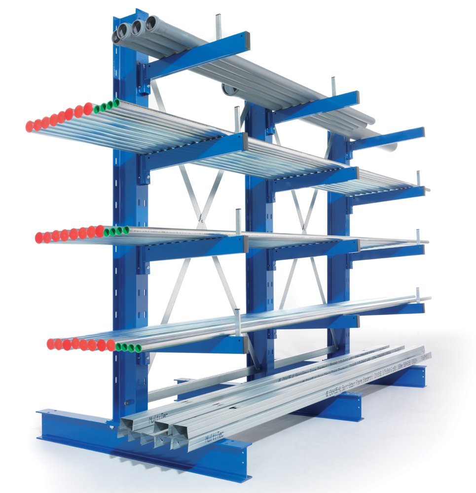 Regál pre stredné zaťaženie pre stojace a ležiace dlhý materiál, výška 2000, šírka 1300, hĺbka 800 mm, počet ramien 4 na jednu stojinu, nosnosť ramena 430 kg, nosnosť jednostranné stojiny 2340 kg. Farba RAL 5010 modrá.