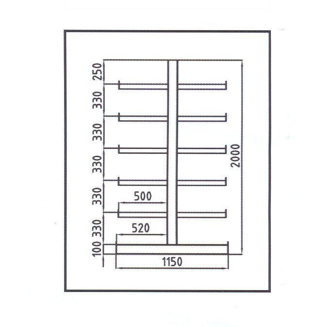 Regály pre stredné zaťaženie pre stojace a ležiace dlhý materiál. Výška 2000 - 3000 mm, šírka 1000 alebo 1300 mm, hĺbka 1000 alebo 1600 mm, počet ramien 8 - 10 na jednu stojinu, nosnosť ramena 250 alebo 430 kg, nosnosť jednostranné stojiny 1250 - 2340 kg. Hmotnosti regálov mezi 50 - 202 kg. Farba RAL 5010 modrá. Iba jedna stojina, slúži ako pokračovanie základnych regálov.