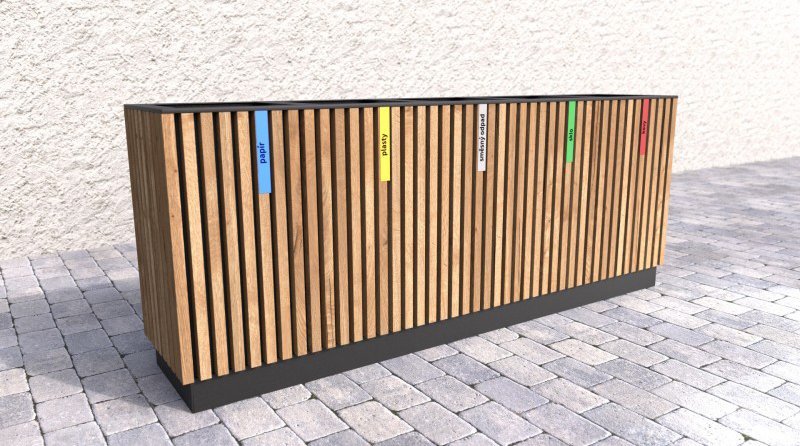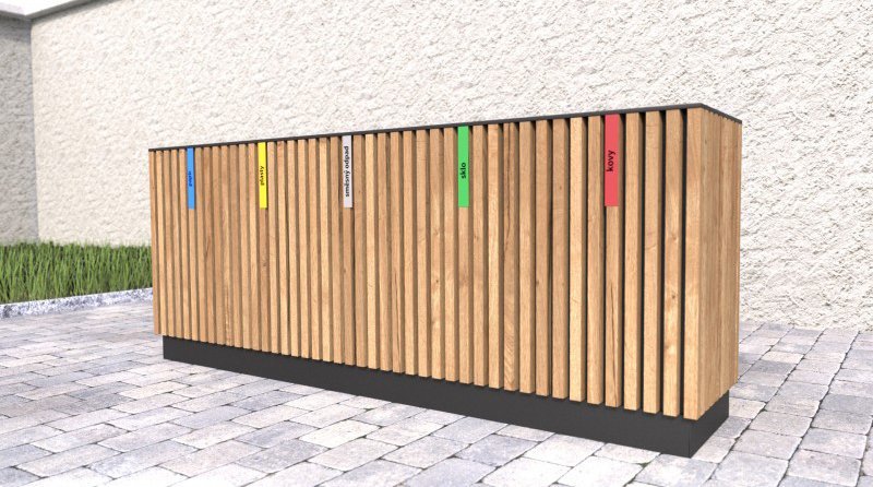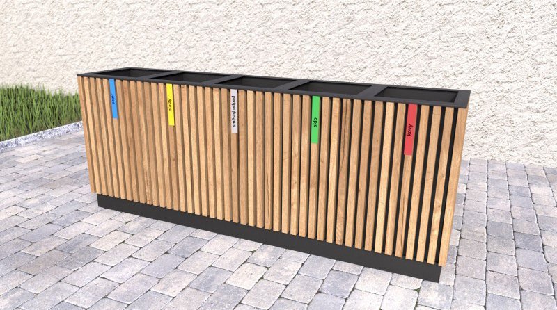 Vonkajší odpadkový kôš na triedený odpad s dreveným plášťom. Drevené laty sú 3x ošetrené lazúrou, ktorá chráni vonkajší nábytok celý popis a parametre