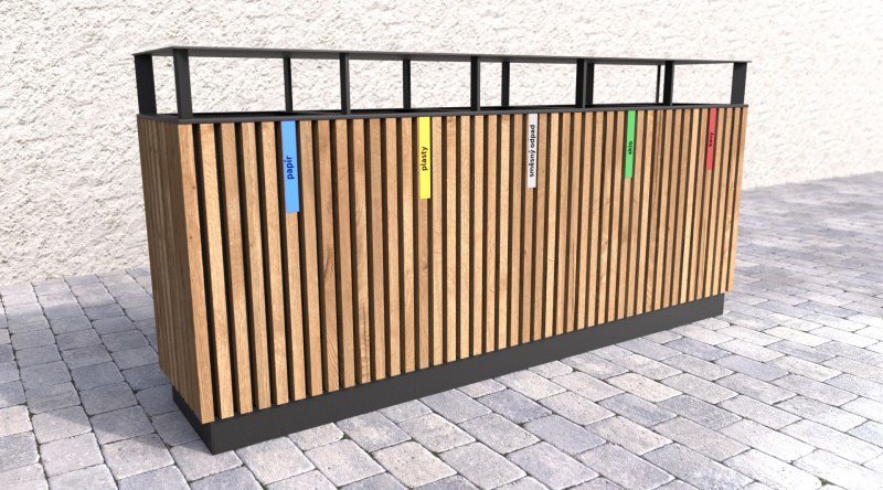 Vonkajší odpadkový kôš na triedený odpad s dreveným plášťom a strieškou. Drevené laty sú 3x ošetrené lazúrou, ktorá chráni vonkajší nábytok pred UV žiarením a poveternostnými vplyvmi. Kôš má vyberateľné pozinkované vložky na odpad s objemom 65 l. Hmotnosť 98 kg.