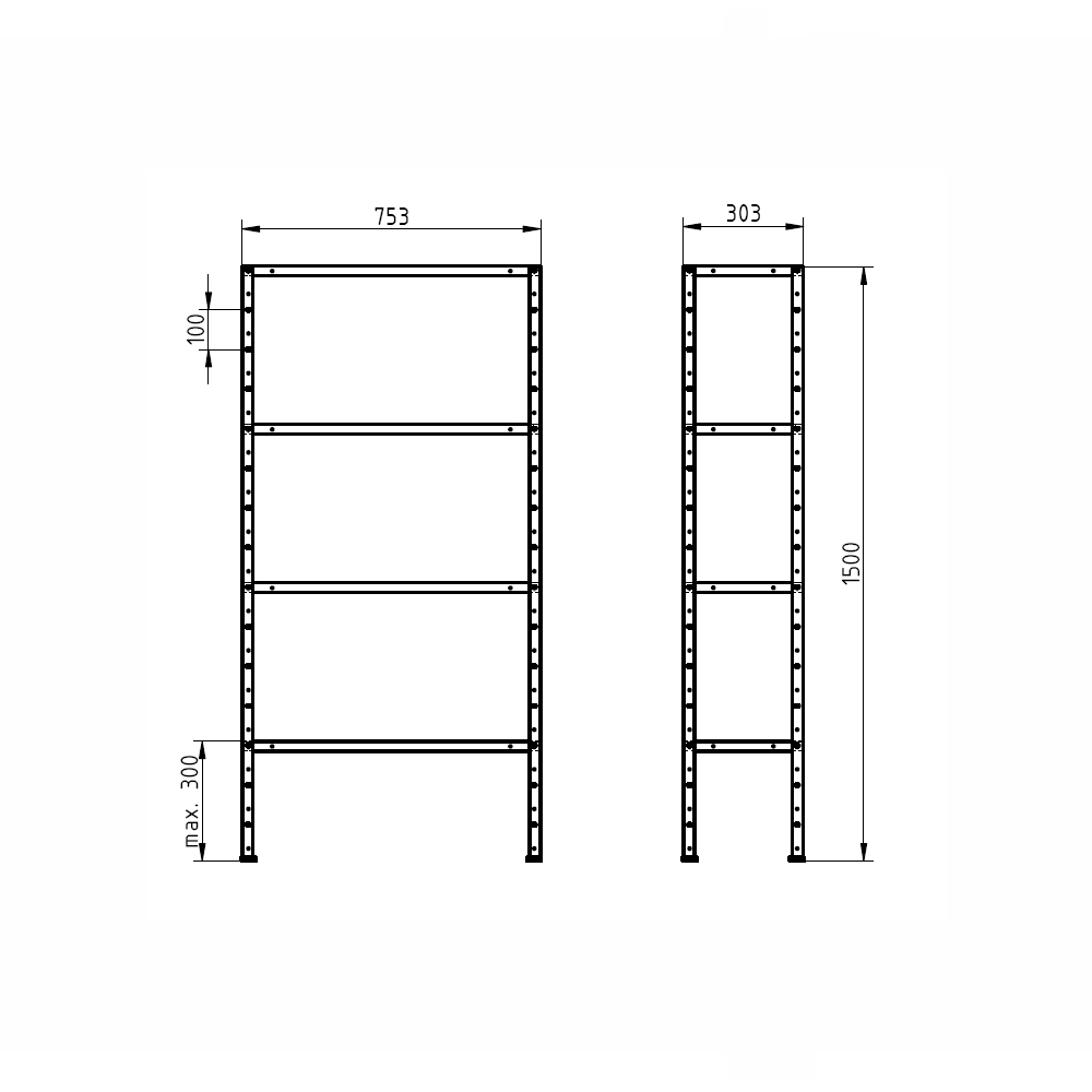Ľahký kovový skrutkový regál určený k širokému použitiu, výška 1500, šírka 750, hĺbka 300 mm. Nosnosť police je stanovená na maximálne rovnomerné zaťaženie 50 kg a slúži k ukladaniu ľahších predmetov. Police sú voľne prestaviteľné po 50 mm. Jednoduchá montáž pomocou skrutkových spojov.