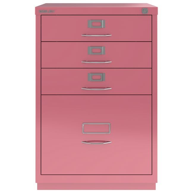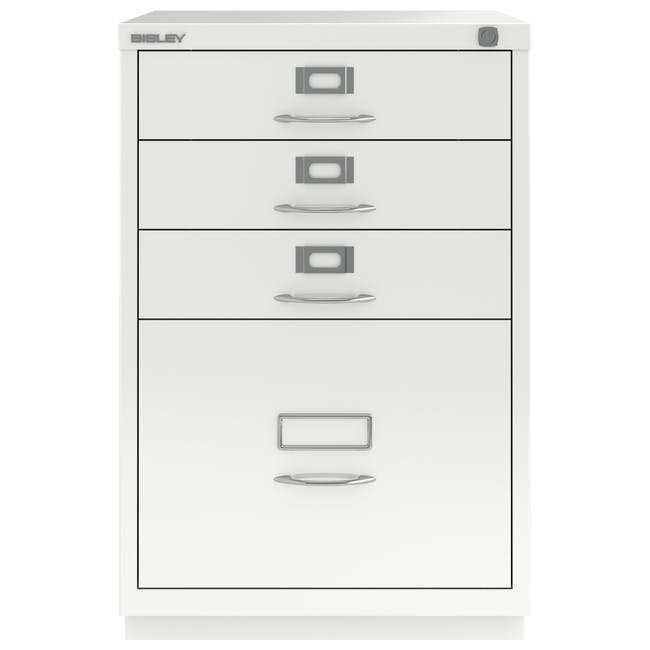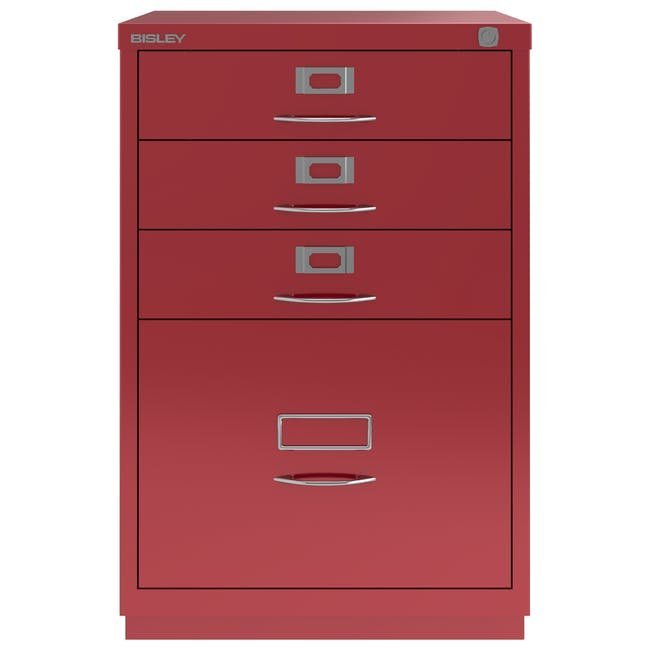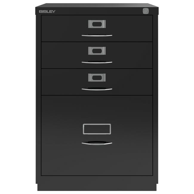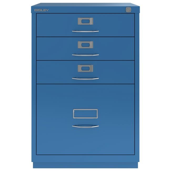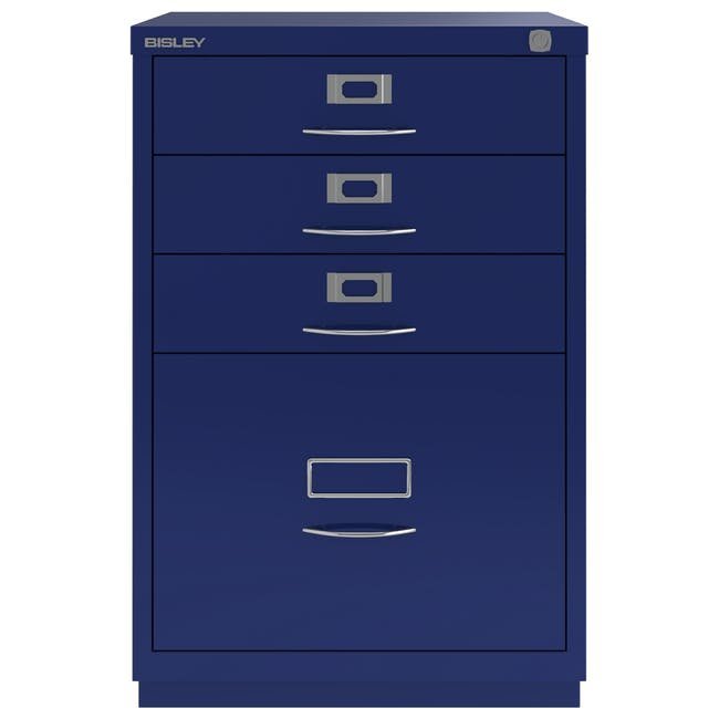 Štvorzásuvková kovová kartotéka Bisley 1F3E, šírka 470, výška 711, hĺbka 470 mm, rôzne farby, klasické úchytky chróm. Vysoká zásuvka je vybavená redukčnou vyberateľnou lištou pre závesné kapsy formátu A4.