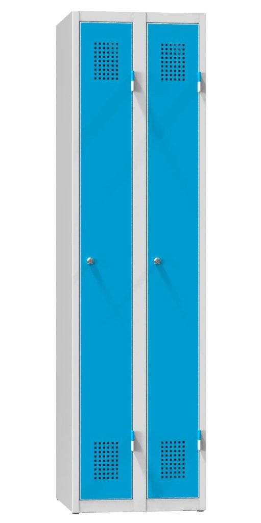 Dvojdverová kovová šatňová skriňa šírka 800 mm, výška 1850 mm, hĺbka 500 mm, v hornej časti každého oddelenia je tyč s tromi plastovými posuvnými háčikmi. Cena bez štítku pre menovku.