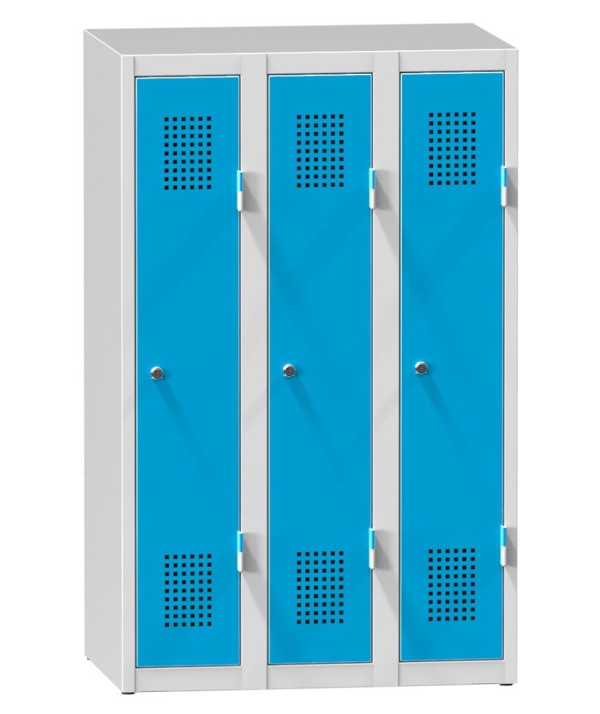 Trojdverová kovová šatňová skriňa šírka 750 mm, výška 1200 mm, hĺbka 500 mm, v hornej časti každého oddelenia je tyč s tromi plastovými posuvnými háčikmi, v spodnej časti polica. Cena bez štítku pre menovku.