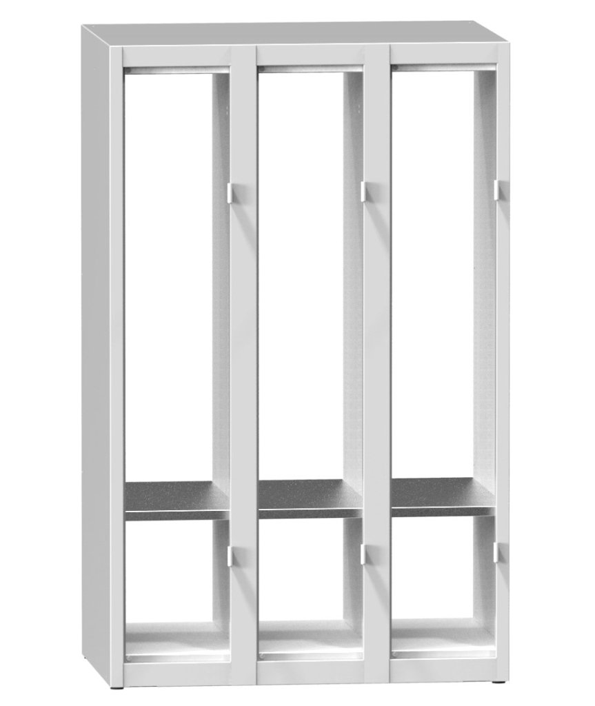 Trojdverová kovová šatňová skriňa šírka 750 alebo 900 mm, výška 1200 mm, hĺbka 500 mm, v hornej časti každého oddelenia je tyč s tromi plastovými posuvnými háčikmi, v spodnej časti polica. Cena bez štítku pre menovku.