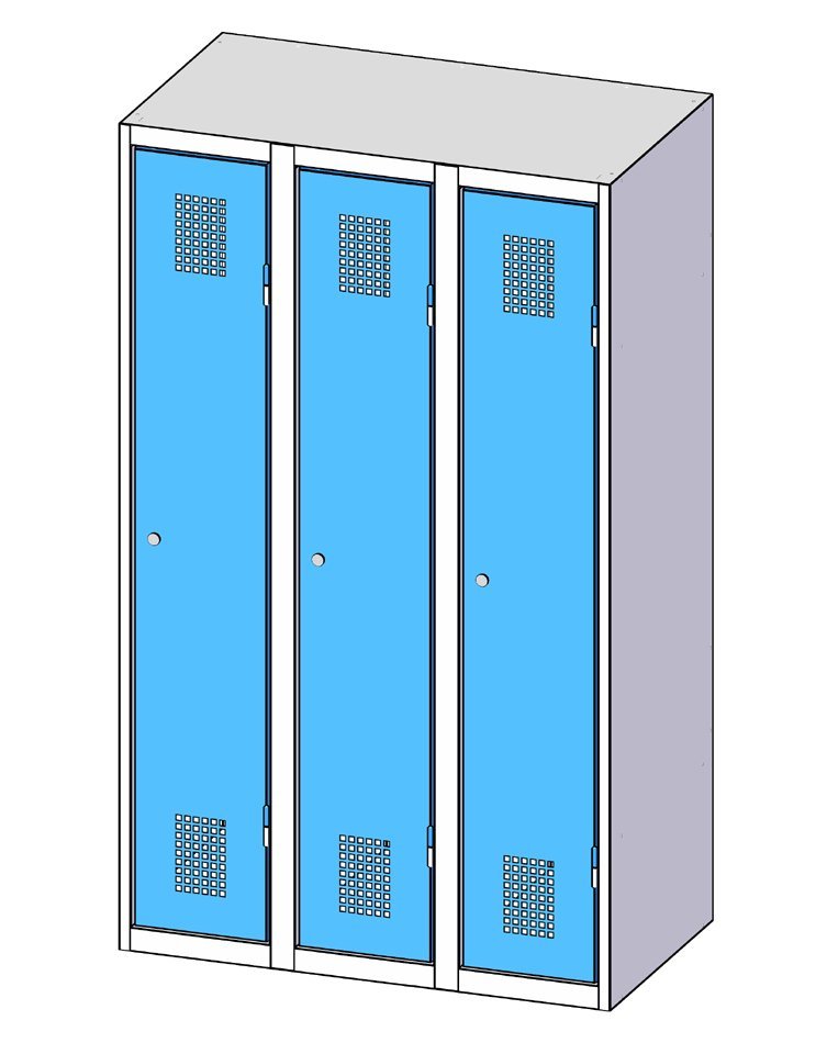 Trojdverová kovová šatňová skriňa šírka 750 alebo 900 mm, výška 1500 mm, hĺbka 500 mm, v hornej časti každého oddelenia je tyč s celý popis a parametre