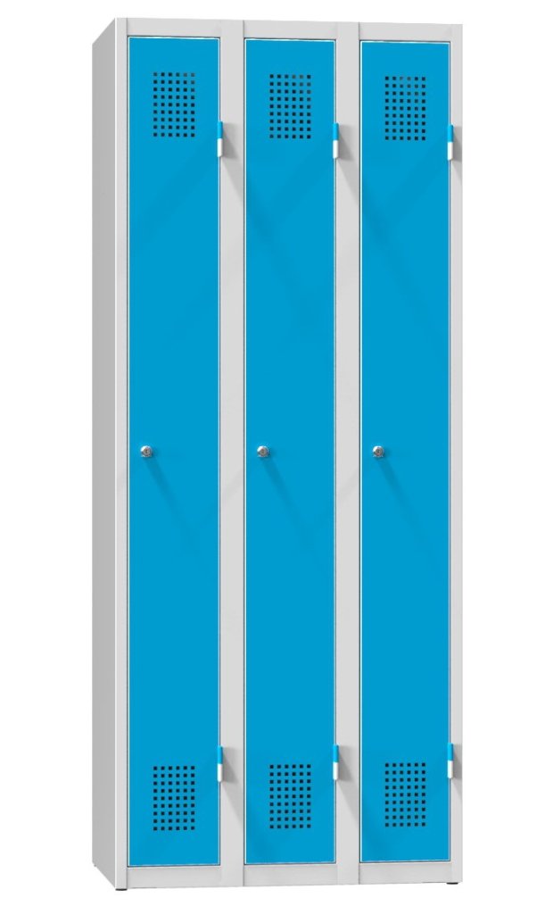 Trojdverová kovová šatňová skriňa šírka 750 alebo 900 mm, výška 1850 mm, hĺbka 500 mm, v hornej časti každého oddelenia je tyč s celý popis a parametre