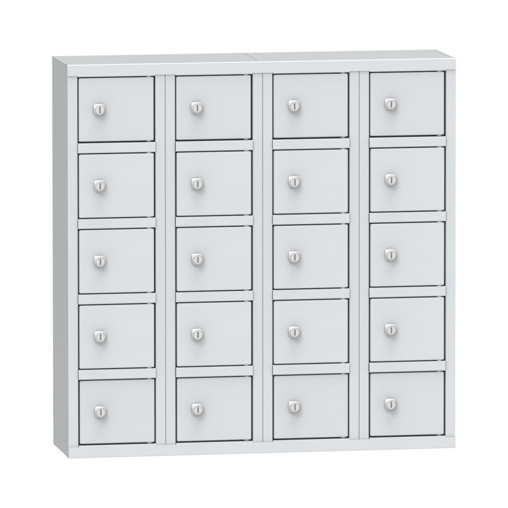 Kovová skrinka s boxami je určená pre úschovu osobných vecí a cenných predmetov menších rozmerov. Rozmery v. 780 x š. 780 x hl. 200 mm, 20 oddelení.