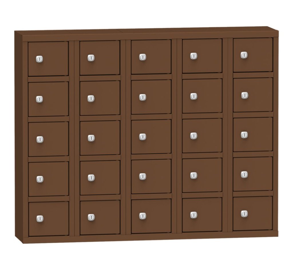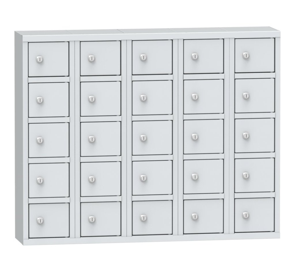 Kovová skrinka s boxami je určená pre úschovu osobných vecí a cenných predmetov menších rozmerov. Rozmery v. 780 x š. 975 x hl. 200 mm, 25 oddelení.