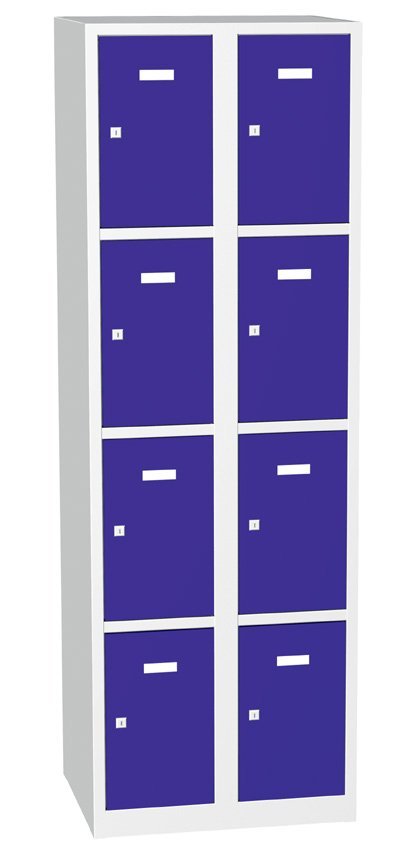 Kovová skriňa s uzamykateľnými boxmi, výška 1800 x šírka 800 x hĺbka 500 mm. Zamykanie na kľúč alebo uzáver pro visací zámok. Farba korpusu RAL 7035 svetlo šedá.