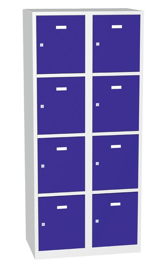 Kovová skriňa s uzamykateľnými boxmi, výška 1800 x šírka 800 x hĺbka 500 mm. Zamykanie na kľúč alebo uzáver pro visací zámok. Farba korpusu RAL 7035 svetlo šedá.