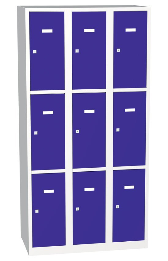 Kovová skriňa s uzamykateľnými boxmi, výška 1800 x šírka 900 x hĺbka 500 mm. Zamykanie na kľúč alebo uzáver pro visací zámok. Farba korpusu RAL 7035 svetlo šedá.