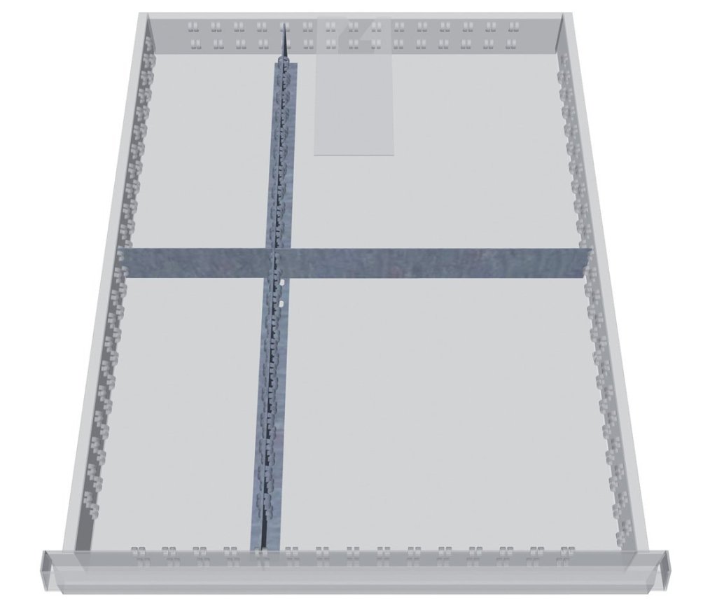 Delenie do zásuviek - set pre 4 zásuvky. Obsahuje 1x gumovou vložku pre zásuvky výšky 50 - 200 mm, 1x plastové delenie pre zásuvky výšky 100 mm, 1x kovové delenie pre zásuvky výšky 100 mm a 1x kovové delenie pre zásuvky výšky 150 mm. Vhodné iba do zásuvkových skríň firmy Bedrunka + Hirth šírky 555 a hĺbky 736 mm.