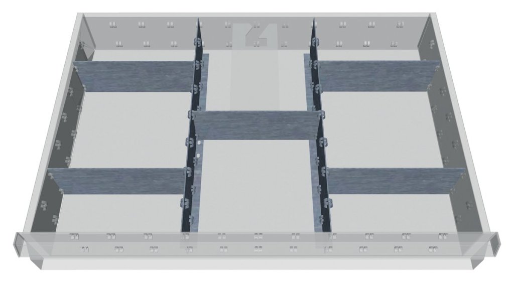 Kovové delenie do zásuviek výšky 100 mm. Vhodné iba do servisných vozíkov firmy Bedrunka+Hirth šírky 680 a hĺbky 500 mm.