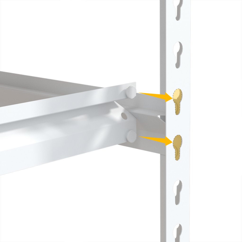Univerzálny kovový bezskrutkový regál vhodný do dielní, skladov, kancelárií, garáží či archívov. Vyrobený z kvalitného oceľového plechu, povrchovo upravený bielou práškovou farbou. 5x prestaviteľná MDF polica s výstuhou. Nosnosť police 175 kg. Rozmery regálu (v x š x hl.) 1830 x 800 x 600 mm. Dodávaný demontovaný.