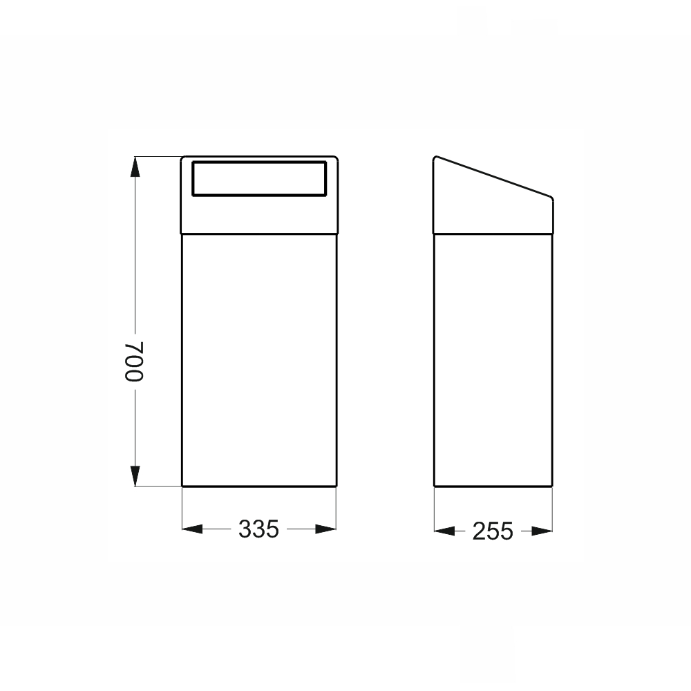 Kovová nádoba na triedený odpad v rôznych farbách. Výška 700 x šírka 335 x hĺbka 255 mm. Samozatvárací vhadzovacia klapka, odnímateľné veko. Pre PE pytle o obsahe 50 l.