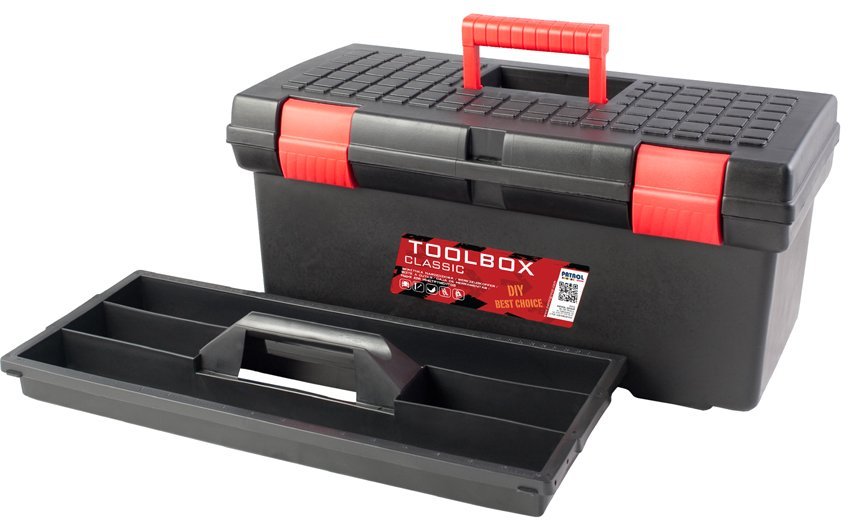 Praktický plastový kufor na náradie. Čierna farba, ucho a zatváranie v červenej farbe. Bočnej rukoväte. Organizér vo vnútri kufra pre lepší prehľad. Otvor pre visiaci zámok. Rozmery (V x Š x H) 190 x 415 x 220 mm. Dopredaj skladových zásob.