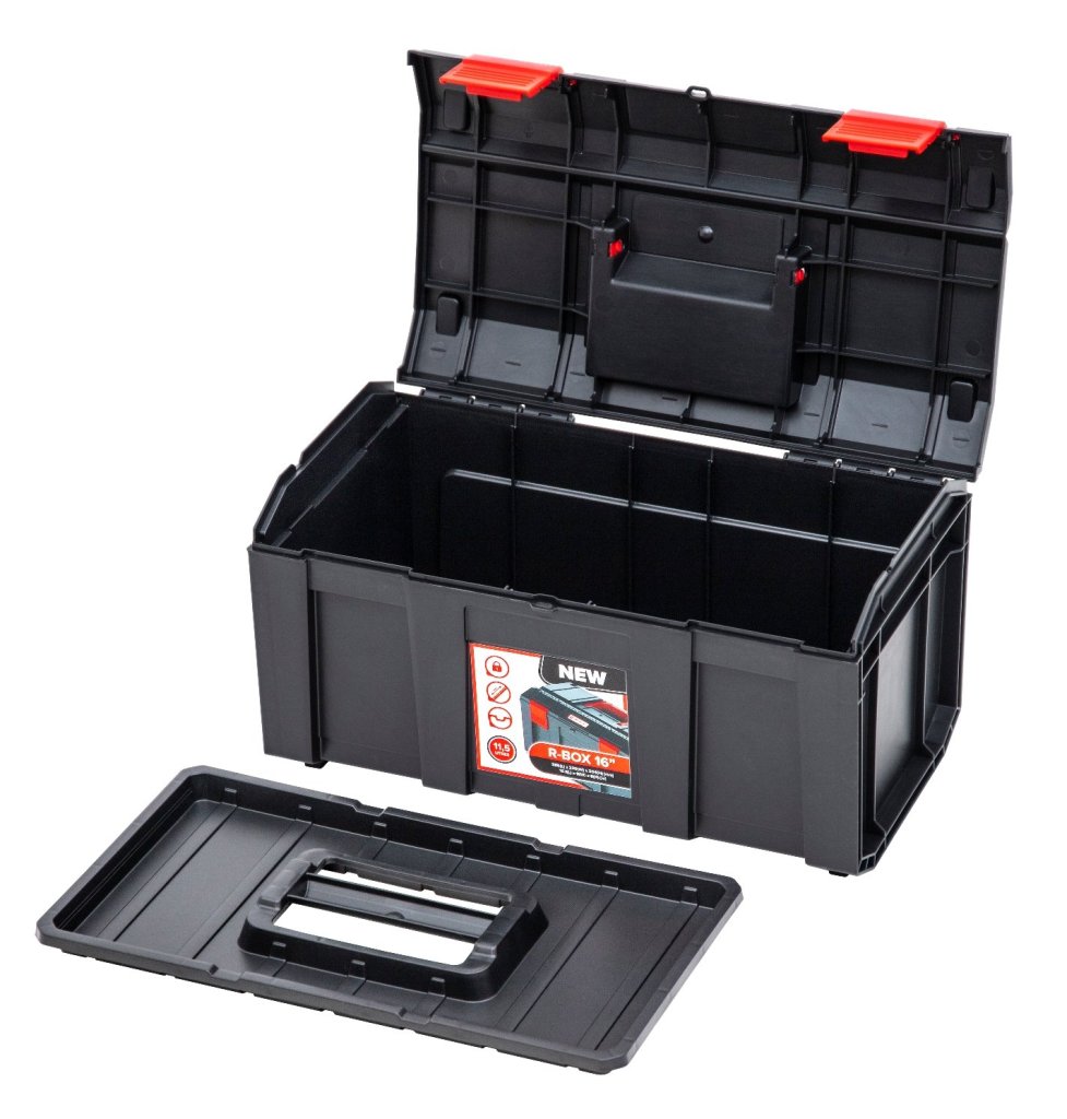 Praktický plastový kufor na náradie. Čierna farba, ucho a zatváranie v červenej farbe. Bočnej rukoväte. Organizér vo vnútri kufra pre lepší prehľad. Otvor pre visiaci zámok. Rozmery (v x š x h) 219 x 395 x 240 mm.