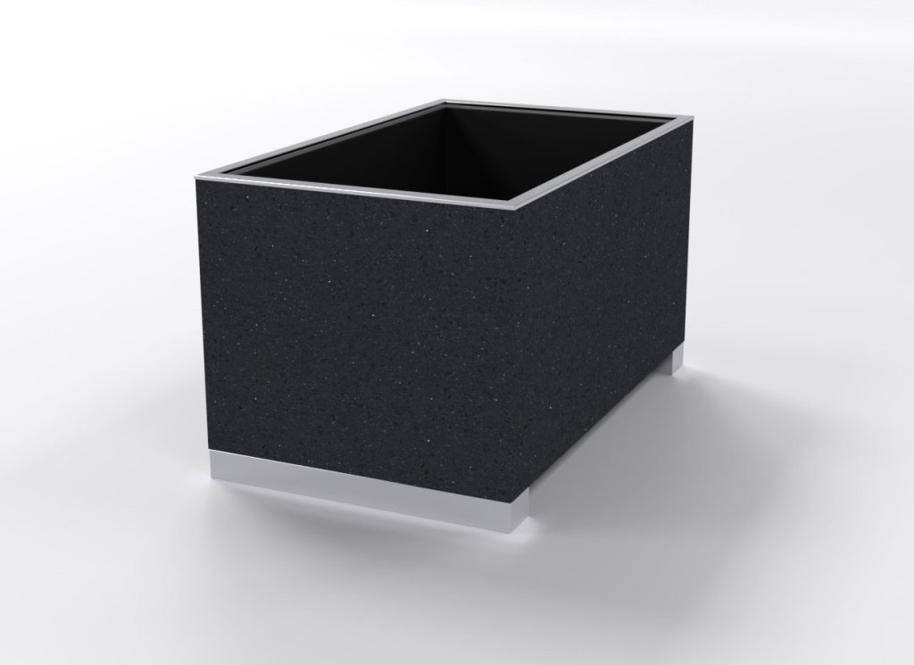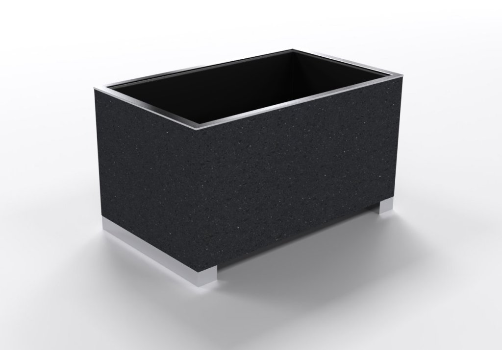 Veľký kvetináč s oceľovou konštrukciou, opláštenie plechové ošetrené vypaľovanou farbou, vnútorná nádoba z pozinkovaného plechu. Výška 700 x šírka 600 x hĺbka 1000 mm.