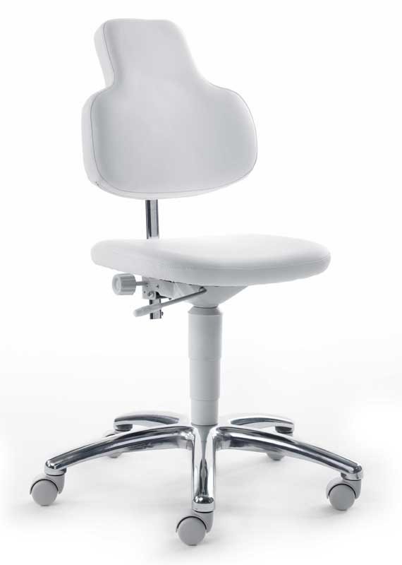 Multifunkčná stolička Medmax. Veľký čalúnený sedák i chrbát s možnosťou rôzneho spôsobu sedenia vďaka dômyslnému tvarovaniu. Križ hliníkový leštěný, kostra svetlosivá.