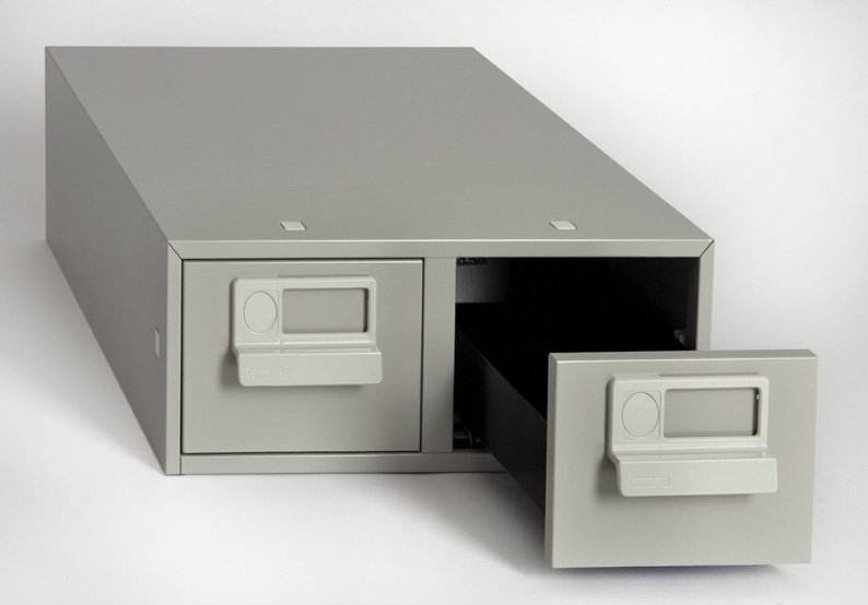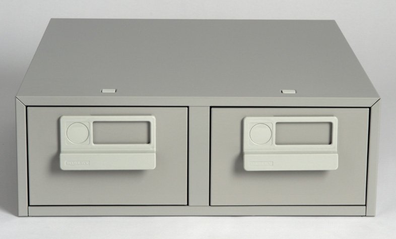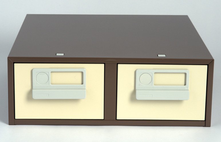 Dvojzásuvkové kovové kartotéky na formát A7. Šírka 384, výška 133, hĺbka 422 mm, cylindrický zámok, rôzne farby. celý popis a parametre