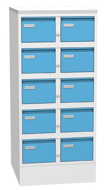 Desaťzásuvková kovová kartotéka pre dokumenty formátu A5. Výška 1250, šírka 560, hĺbka 600 mm. Farba korpusu svetlosivá RAL 7035, rôzne farby zásuviek.