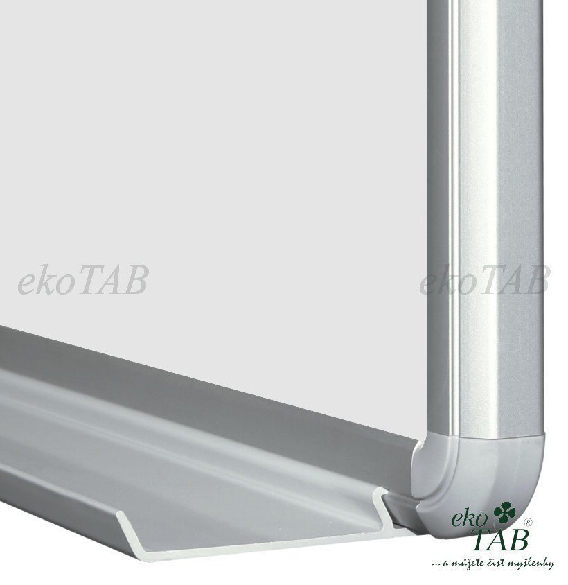 Jednodielna magnetická tabuľa s bielym lakovaným povrchom. Rám z eloxovaného hliníka v prírodnom odtieni, plastové rohy. Súčasťou je odkladacia polička na popisovače. Dodávané vrátane montážnej sady na stenu.