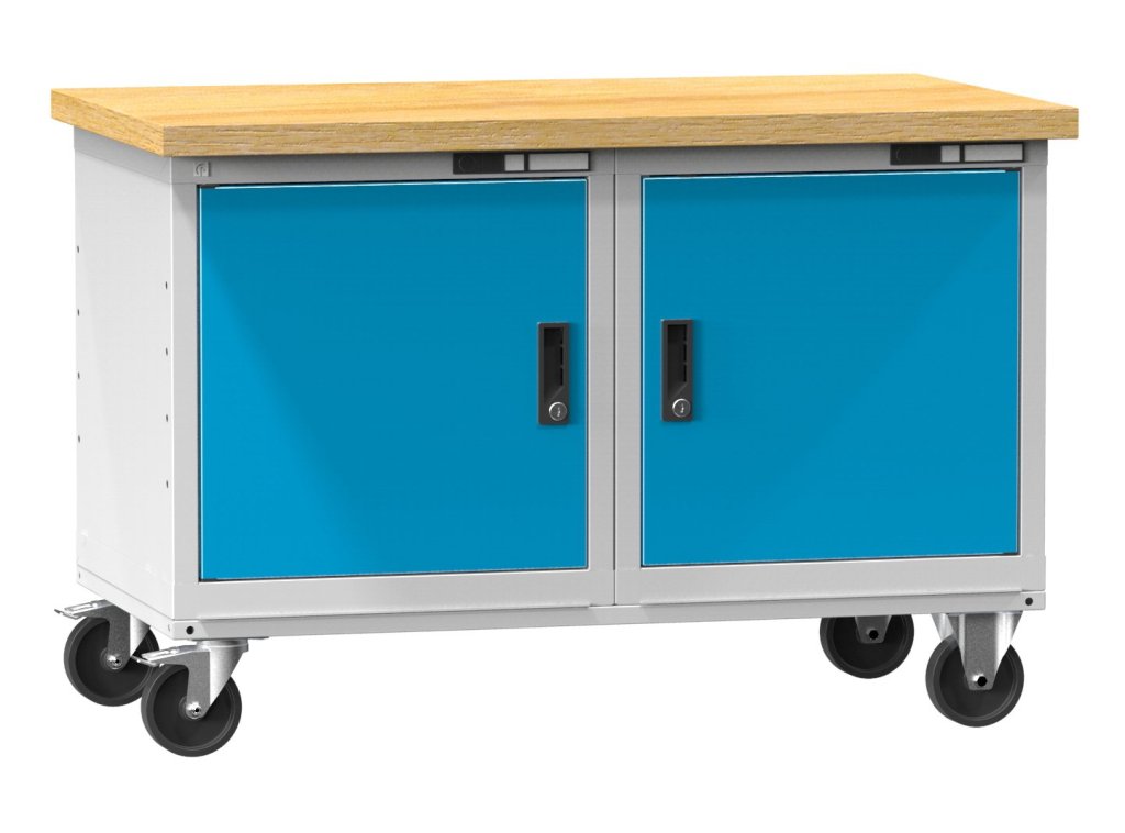Mobilný pracovný stôl, pracovná doska 1200 x 700 x 40 mm, výška stola 810 mm. Pracovná doska buk multiplex (označenie M - vrstvená buková dyha) - hrúbka 40 mm alebo škárovka buk hrúbky 40 mm. Nosnosť stola 380 kg.