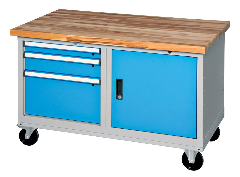 Mobilný pracovný stôl, pracovná doska 1200 x 700 x 40 mm, výška stola 810 mm. Pracovná doska škárovka buk hrúbky 40 mm alebo buk multiplex (označenie M - vrstvená buková dyha) - hrúbka 40 mm. Nosnosť stola 340 kg.