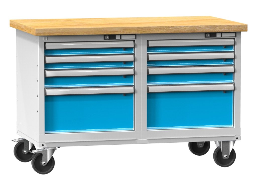 Mobilný pracovný stôl, pracovná doska 1200 x 700 x 40 mm, výška stola 810 mm. Pracovná doska buk multiplex (označenie M - vrstvená buková dyha) - hrúbka 40 mm alebo škárovka buk hrúbky 40 mm. Nosnosť stola 380 kg.
