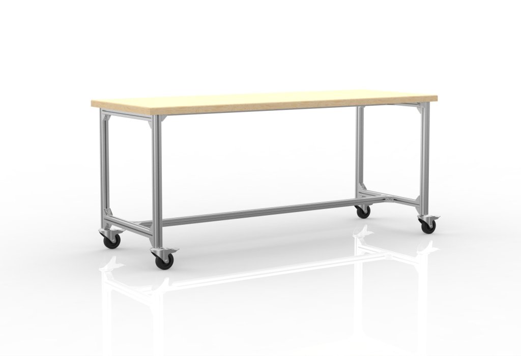 Pojazdný pracovný stôl z hliníkových profilov, ktorý vďaka kolieskam umožňuje jednoduchú manipuláciu a rýchle presunutie pracovného miesta.