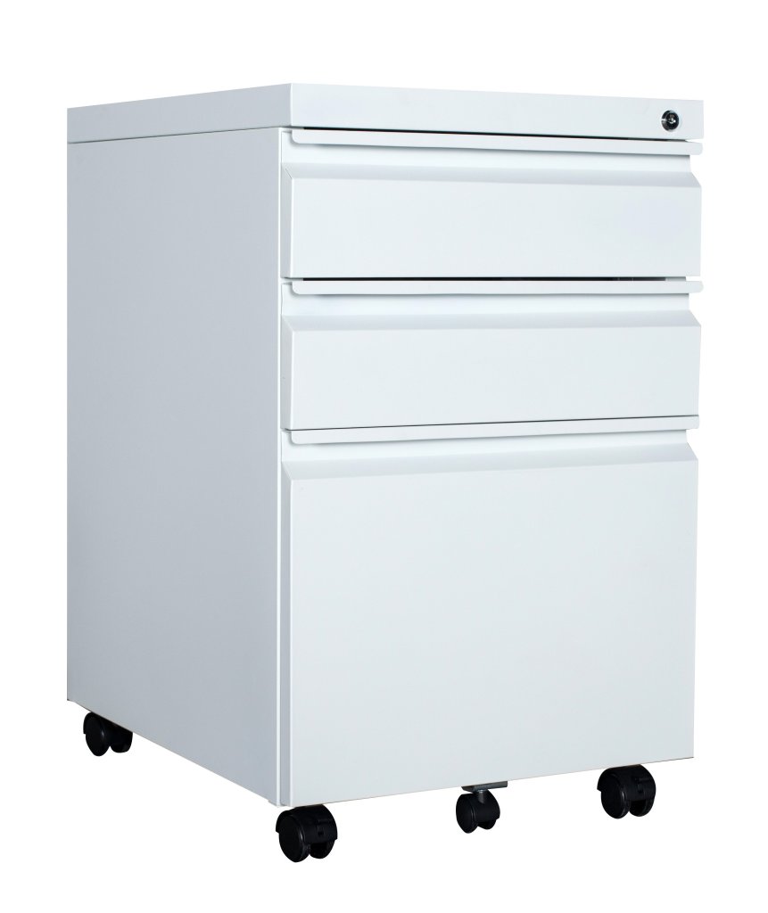 Mobilný trojzásuvkový kontajner z oceľového plechu hrúbky 0,6 mm. Výška 643 x šírka 405 x hĺbka 500 mm, centrálny zámok. Povrchová úprava šedou práškovou farbou RAL 7047.