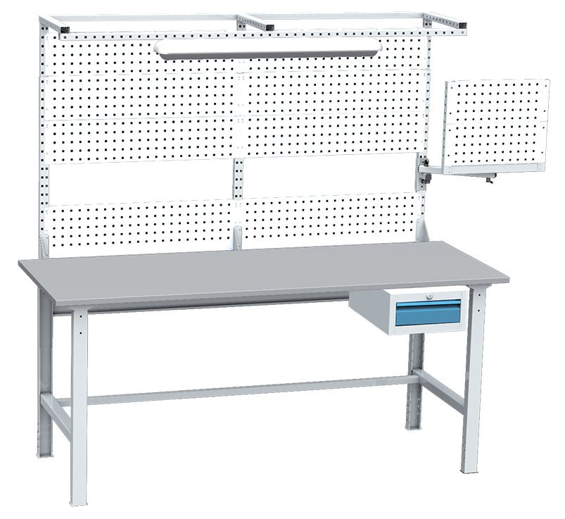 Montážny stôl, zostava MTS 203, šírka 2400, staviteľná výška 1900 - 2180 , hĺbka 750 mm. Súčasťou stola je zadný perfopanel, rampa, 1x bočný perfopanel, podvesná zásuvka a dvojtrubicová žiarivka.
