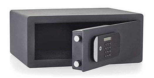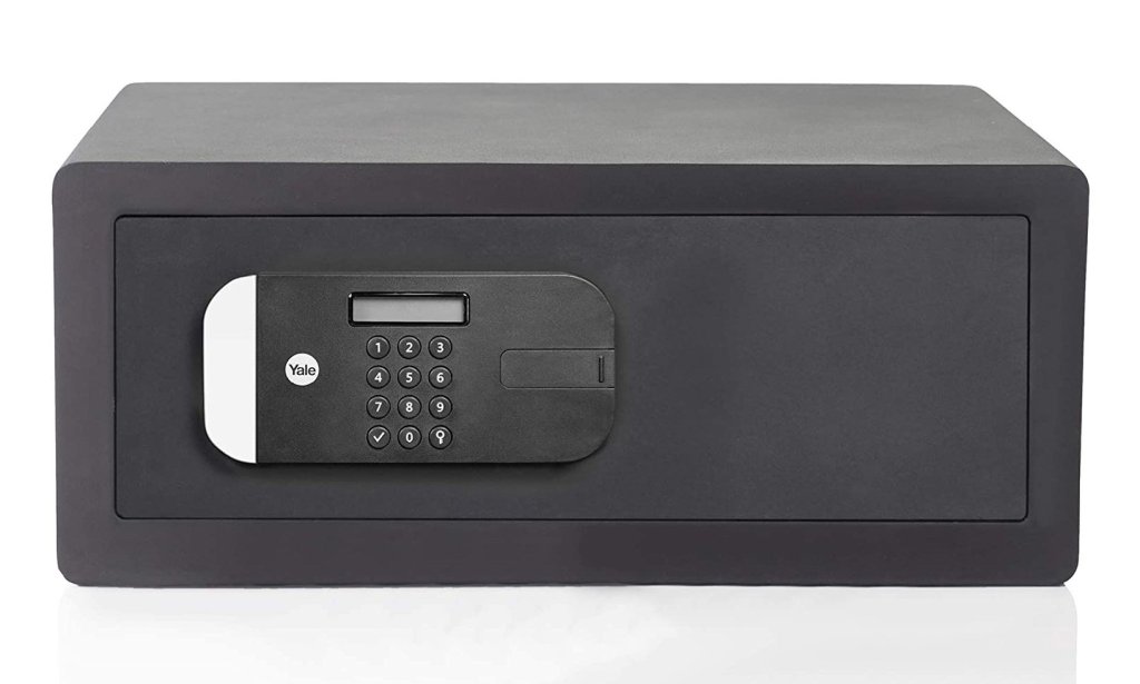 Nábytkový sejf Yale Guest Laptop, zamykanie na elektronický kód, modro podsvietený displej, pákový obojstranný systém zamykania. Výška 200 x šírka 430 x hĺbka 350 mm, vnútorné rozmery 197 x 427 x 287 mm, vhodný pre laptop.