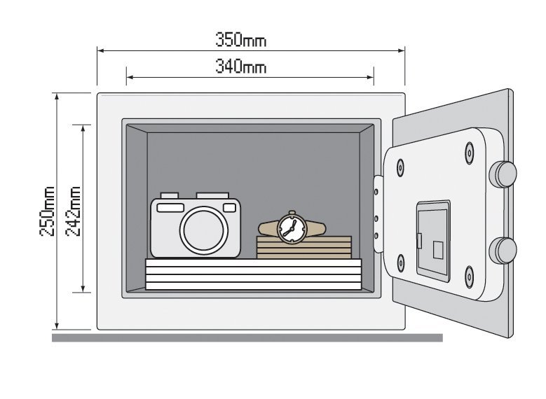 Nábytkový sejf Yale Value Medium, zamykanie na elektronický kód, bez displeja, pákový obojstranný systém zamykania. Výška 250 x šírka 350 x hĺbka 250 mm, vnútorné rozmery 240 x 340 x 200 mm.