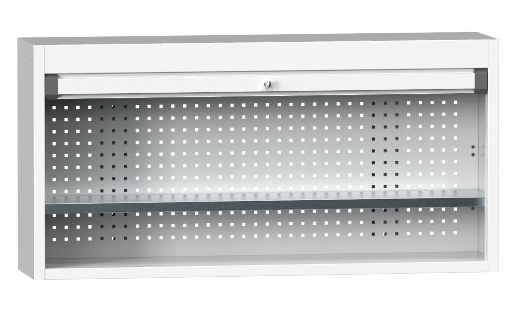 Skriňová nadstavba pracovného stola, hliníková roleta s pružinovým navíjaním a rozvorovým zámkom, 1x police. Šírka 1000 mm, výška 736 mm, hĺbka 350 mm. Pre umiestnenie osvetlenia (SLIMp30) pod skrinku je nutné objednať aj magnetické uchytenie.