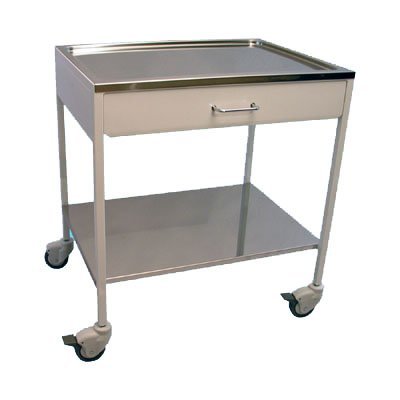 Pojazdný nástrojový stolík s nerez doskou a zásuvkou sa skladá z kovovej konštrukcie, ktorá je povrchovo upravená práškovou technológiou. Vrchná doska je antikorová a dolná odkladacia doska je z oceľového plechu.