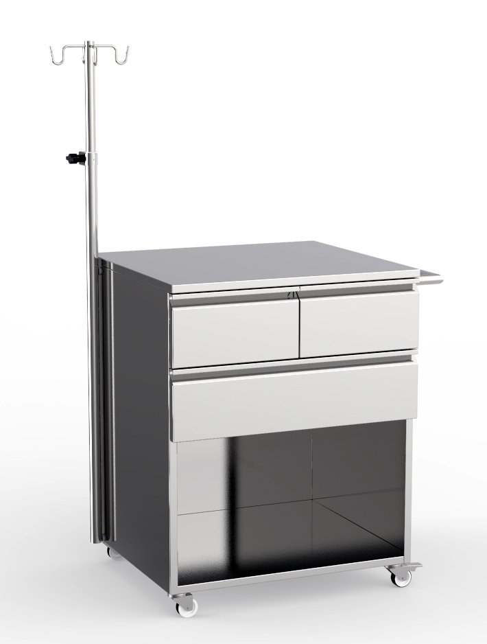 Chirurgický stôl je vyrobený z plechu hrúbky 0,8 mm. Výška 880 mm, šírka 1000 mm, hĺbka 600 mm. Priestranná doska stola umožňuje uloženie veľkého množstva prístrojov a nástrojov. Ľahkú manipuláciu zaisťujú 4 otočné kolieska, z ktorých 2 sú s brzdou.