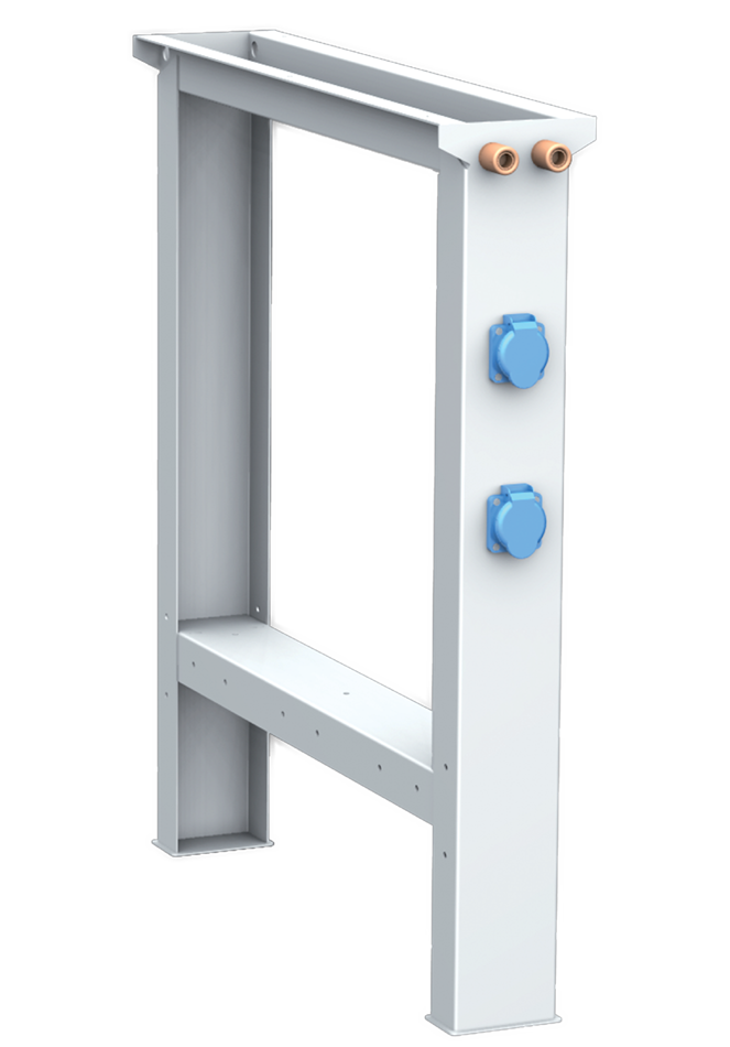 Noha s dvoma elektrickými zásuvkami 230V / 16A a dvoma rýchlospojkami pre pripojenie vzduchu. Výška 810 mm, šírka 150 mm, hĺbka 699 mm, farba svetlosivá RAL 7035.